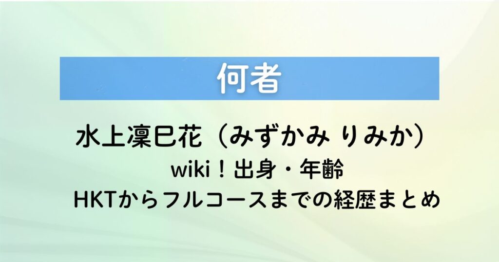 HKT48として活躍していた、水上凜巳花(みずかみ りみか)さん。 気になるのは、 「どんな人?」「出身や年齢は?」「HKT48のあと、今は何してるの?」 といったところかもしれません。 この記事では、水上凜巳花さんのプロフィールや経歴をHKT48時代、フ... -