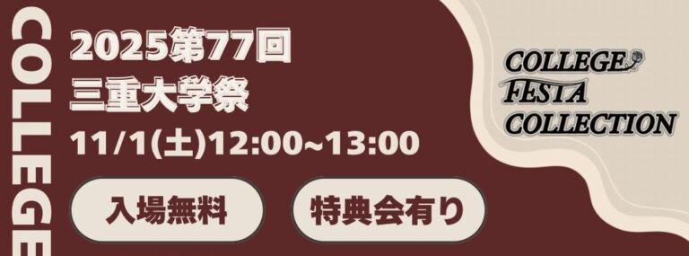 2025年第77回三重大学全学大学祭 カレッジフェスタコレクションLIVE FESが開催されます!観覧無料です! 「NO❤AF」、「EKVA」、「ToPDoG」 の3組の皆さんに参戦していただきます☻ 日程:11/1(土 […]